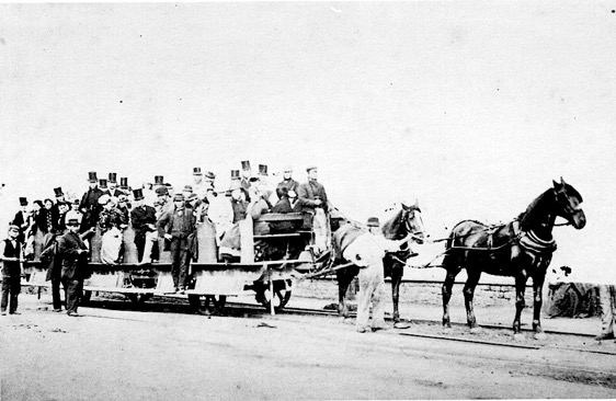| An early photo of open car horse drawn service on the Swansea and Mumbles Railway. Probably a vary pleasant hour or so on a lovely spring day, but undoubtedly miserable in Wales's snowy winters. |