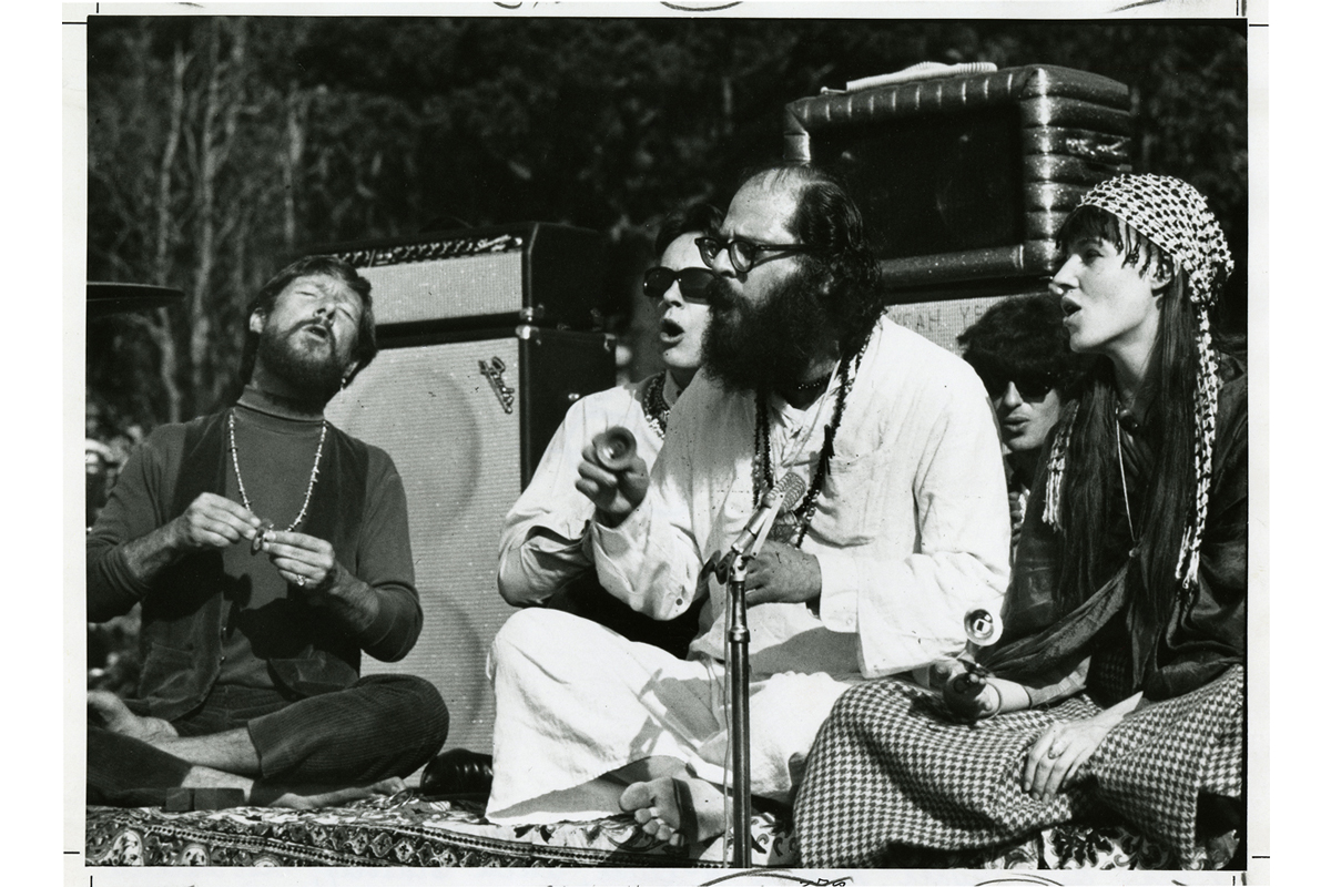Gary Snyder, Michael McClure, Allen Ginsberg, Freewheelin’ Frank, and Marcetta lead chanting at the Human Be-In